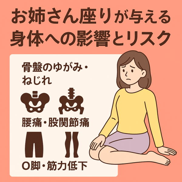 見た目にはきれいでも、「お姉さん座り」は片方の骨盤に体重が集中し、股関節の内旋・外旋がアンバランスになることがあります。その結果、骨盤のねじれや背骨の湾曲、さらには腰や膝への負担を生みやすいとされています。