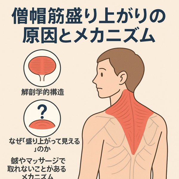 また、筋トレで肩を鍛えすぎて僧帽筋が肥大するケースもありますが、ほとんどの場合は筋緊張やコリによるものです。筋肉内の血行が悪化すると、代謝物質が蓄積し、炎症性の硬結(しこり)を生じることがあります。この硬結が表面から見たときに“盛り上がり”として感じられる場合もあります。