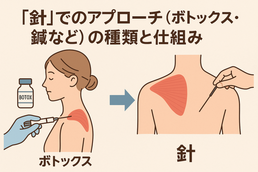 一方、東洋医学的な「鍼(はり)」による施術も、筋肉の盛り上がりやこりにアプローチする方法として知られています。ボトックスが「神経伝達を抑える」のに対し、鍼は「血流促進と筋肉の自然な弛緩(しかん)」を目的としています。