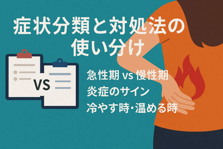 急性期の痛みは、筋肉や靱帯を痛めて炎症が起きているケースが多く、「まずは安静にし、炎症を悪化させないこと」が大切だとされています。一方、慢性期は筋肉のこわばりや血行不良、自律神経の乱れが背景にあることが多く、**“温めて巡りを良くする”**ことが有効とされています。