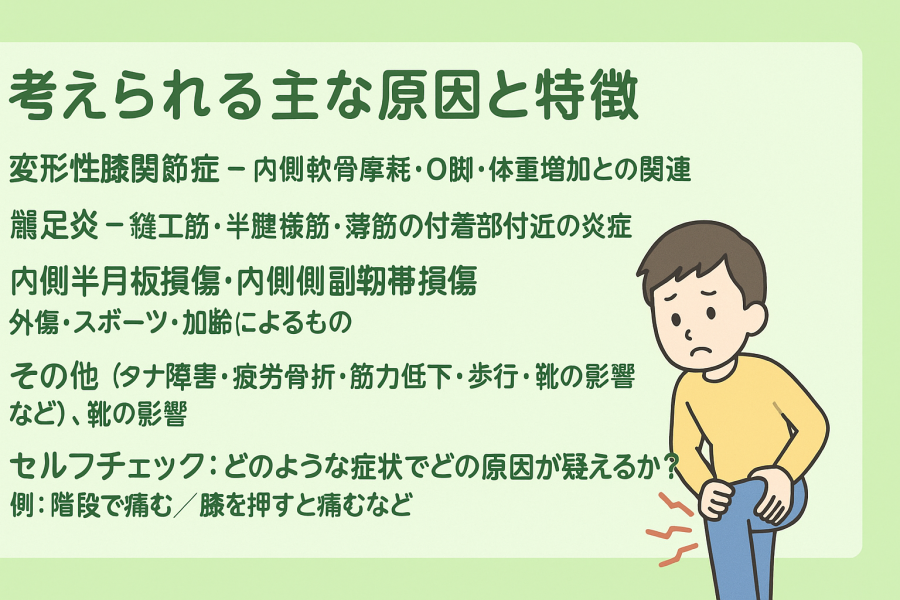 「膝内側の痛みを感じたら要チェック!原因として多い鵞足炎・変形性膝関節症・半月板損傷などを解説し、セルフチェック・ストレッチ・日常習慣の見直しまで、専門家視点でわかりやすく紹介します。」