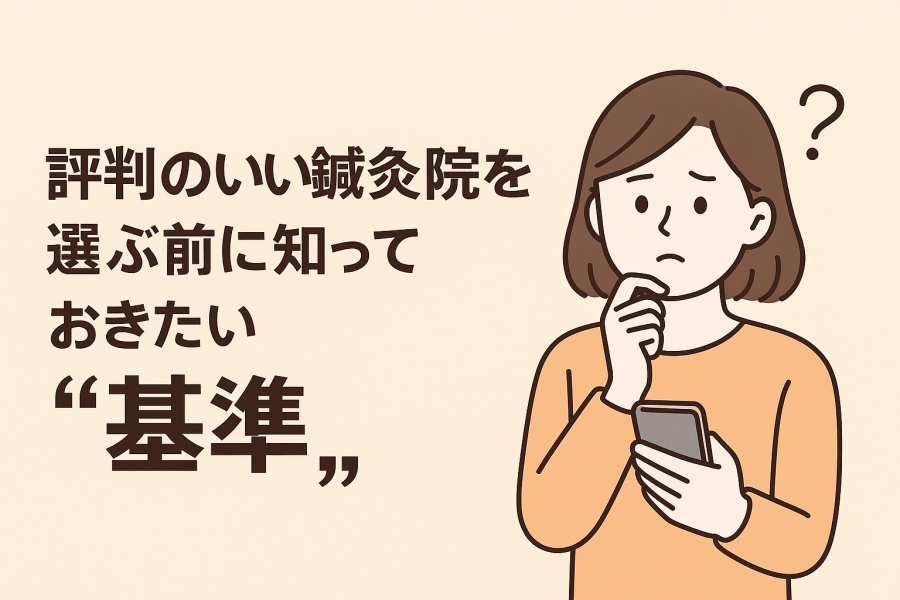ChatGPT Image 2025年10月13日 15_49_54鍼灸院を探すとき、「どこが評判いいの?」と迷う方は多いものです。実際、口コミが良いからといって必ず自分に合うとは限りません。ここでは、信頼できる鍼灸院を見極めるために押さえておきたい“5つの基準”を紹介します。初めての方でも安心して比較できるよう、ポイントを整理しました。