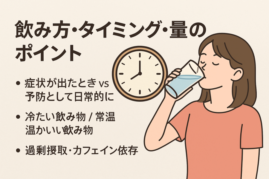 「頭痛に効く飲み物」といっても、ただ“何を飲むか”だけでなく、“いつ・どのくらい・どんな温度で飲むか”によって体の反応は変わると言われています。ここでは、頭痛のタイプや体調に合わせた飲み方のポイントを整理してみましょう。