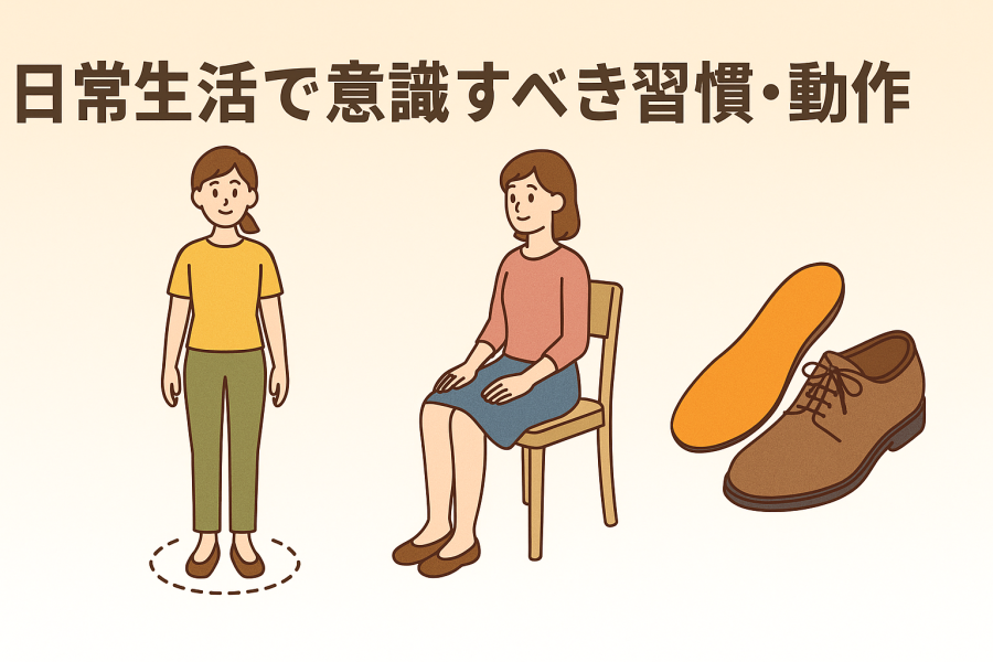 「じゃあ、何に気をつければいいの?」とよく質問されますが、まず大切なのは“姿勢の意識”です。立つときは両足に均等に体重をかけ、骨盤を立てて背筋を伸ばす。座るときは脚を組まず、椅子の奥までしっかり腰をかける。たったそれだけでも、膝への負担はずいぶん違ってくるそうです。