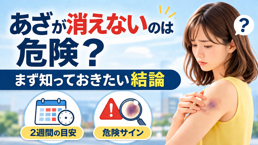 あざが消えないのはなぜ?通常の治る期間との違いや考えられる原因、危険なあざの特徴、早く消すための対処法、受診の目安まで分かりやすく解説します。