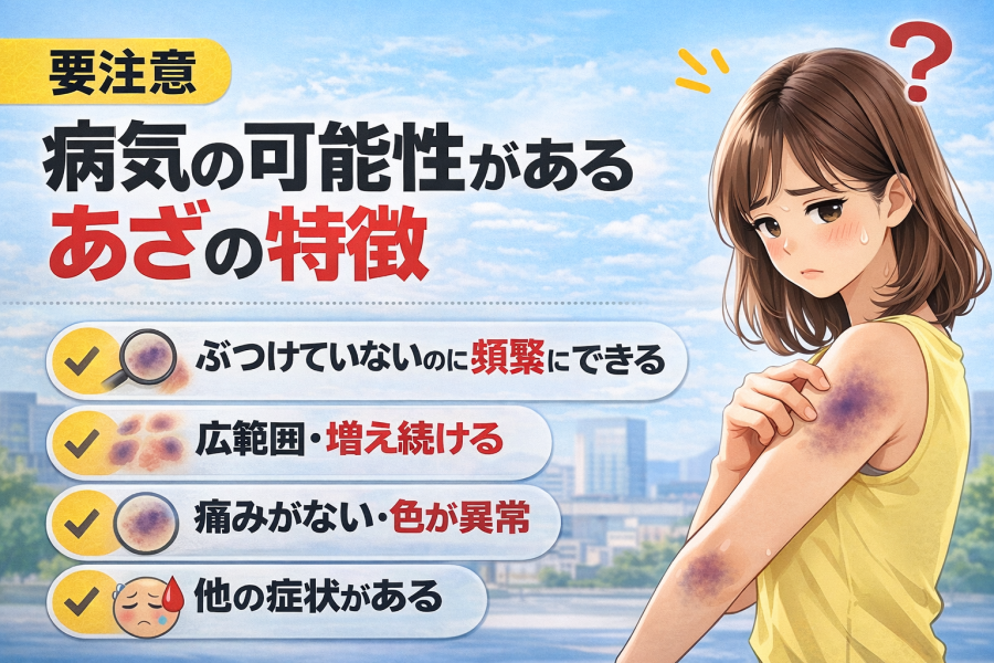 基本的にあざは自然に改善していくものですが、なかには体の異常サインとして現れるケースもあると考えられています。特に、“でき方”や“増え方”が普段と違う場合は見逃さないことが大切です。