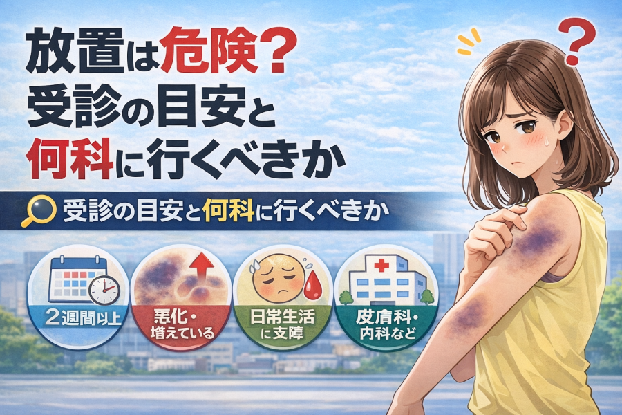 基本的には、皮膚のトラブルとして皮膚科が最初の窓口になることが多いと言われています。もし、だるさや出血しやすさなど全身症状がある場合は、内科での相談も選択肢になります。