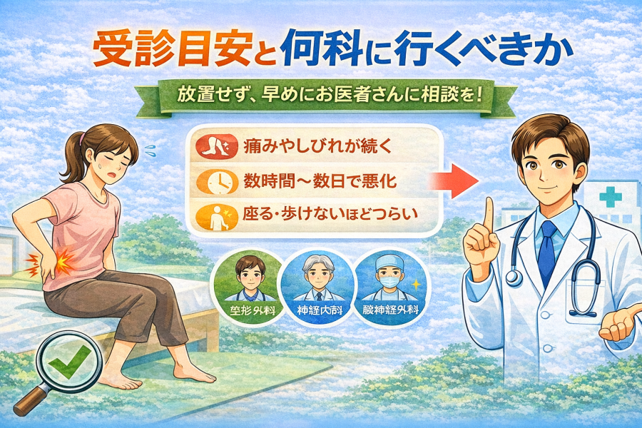 お尻が痛い状態が続くと、こう迷う人は多いです。実際、痛みの強さや出方によっては、早めに専門家へ来院したほうがよいケースもあると言われています。ここでは、その判断の目安と、行き先の考え方を整理します。
