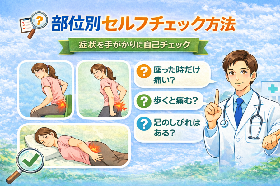「座った瞬間にツラい」「立つと少し楽」など、動作との関係も大切なポイントです。