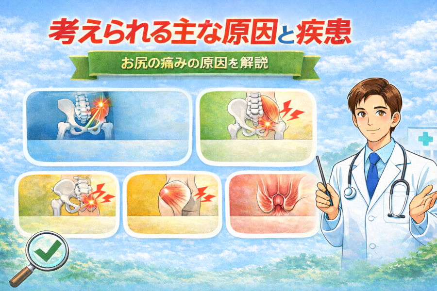 ここが一番知りたいところですよね。実は、お尻の痛みにはいくつか代表的な原因があり、症状の出方によって傾向が違うと言われています。順番に見ていきましょう。
