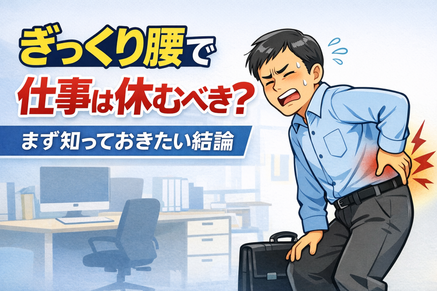 191ac546-87d6-48a1-8f4a-7a1f3e40514cぎっくり腰になったとき、「これ仕事行っていいの?」って迷いますよね。結論からいうと、ぎっくり腰で仕事を休むべきかは“症状の強さ”と“仕事内容”で判断が必要と言われています。