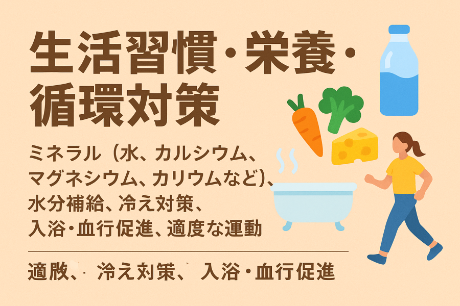 また、夜間のつりが多い場合は「冷え」「水分不足」「寝具の硬さ」などの環境要因も影響していることがあるため、寝る前の温めや水分補給を心がけることが大切です。