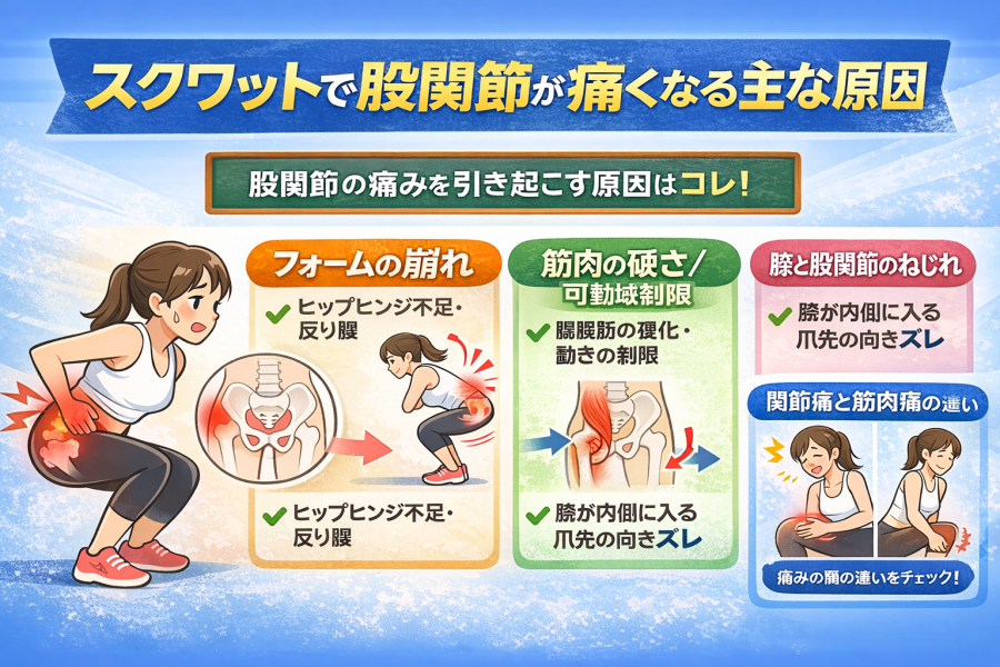 スクワット 股関節 痛みの原因を徹底解説。痛みが出るフォームの特徴・股関節の可動域や筋肉の硬さによる影響・具体的なストレッチと改善エクササイズを写真付きで分かりやすく紹介します。