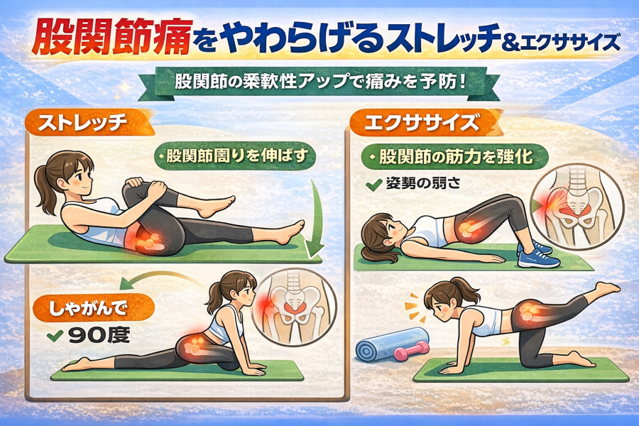 こんな疑問を持つ人は多いと言われています。フォーム改善と並行して、ストレッチやエクササイズを取り入れることで、股関節の負担がやわらぐケースがあるようです。ここでは、比較的取り組みやすい方法を中心に紹介します。
