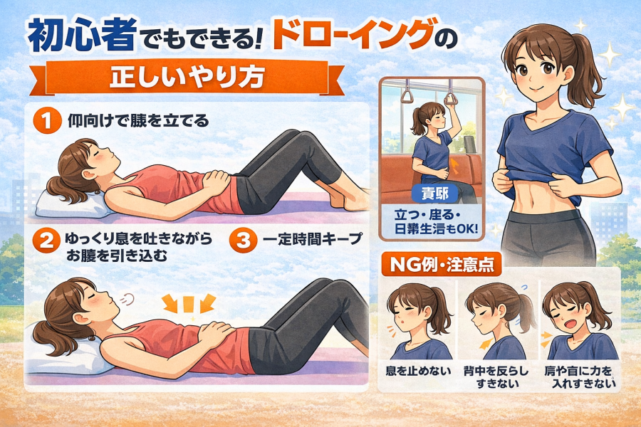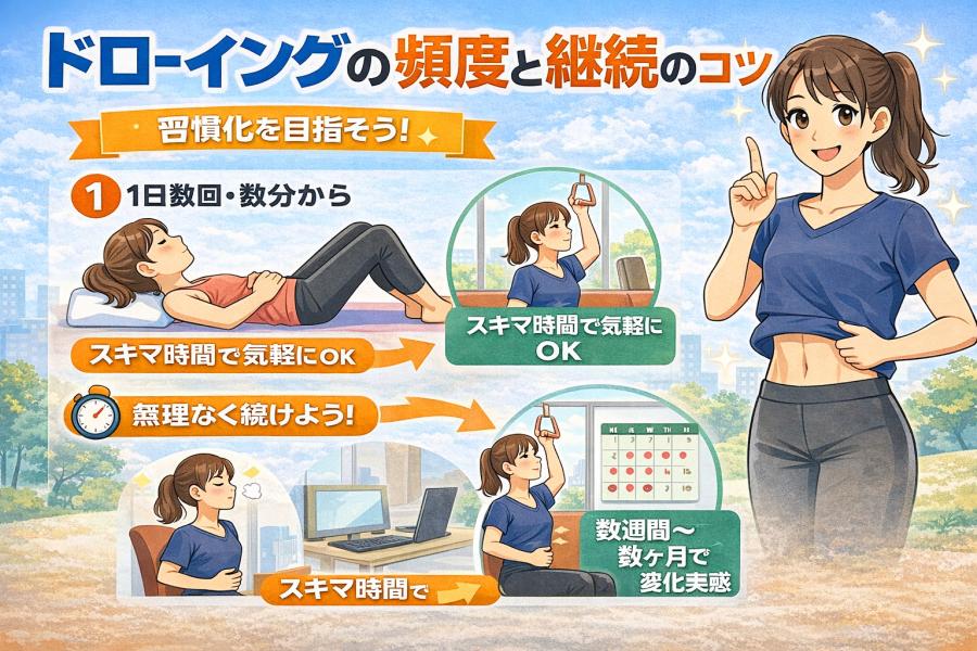 ドローイングはあくまで呼吸と意識が中心です。「力を入れなきゃ」と思いすぎず、リラックスした状態で行うほうが続けやすいと言われています。違和感がある場合は無理をしないことも大切です。