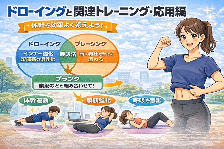 ただし、無理に同時進行しようとするとフォームが崩れやすくなります。「まずはドローイング単体で感覚をつかむ→余裕が出たら応用」という段階的な取り入れ方がすすめられることもあります。