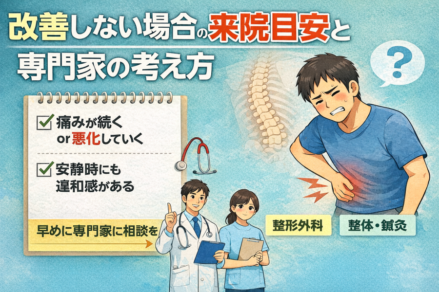 ただし、数週間たっても痛みが続く場合や、以前より強くなっていると感じる場合は、一度体の状態を確認してもらう考え方が大切だとされています。