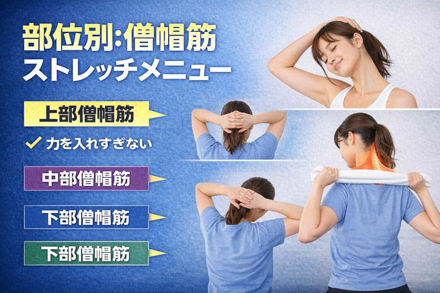 僧帽筋 ストレッチで肩こり・首こりを根本改善!上部・中部・下部に分けた正しいストレッチ方法や効果的な実践ポイント、よくある質問まで丁寧に解説します。
