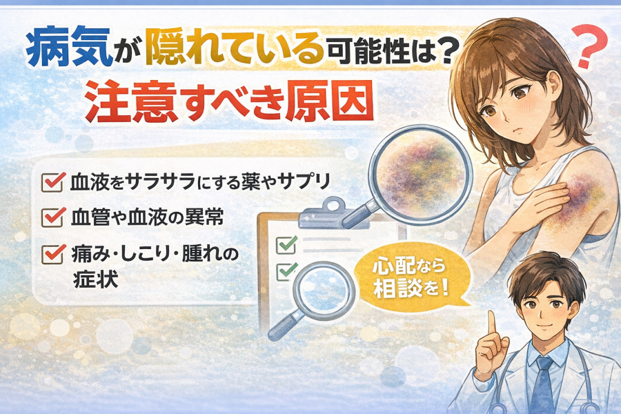 内出血が短期間で繰り返し起こる、数が増えている場合、体の状態として一度確認したほうがよいケースもあると言われています。偶然の重なりもありますが、頻度が気になるときは放置しない考え方が安心につながるようです。