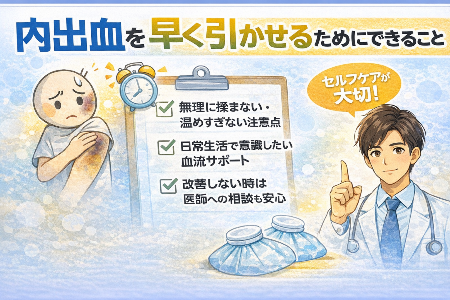 「若い頃はすぐ引いたのに…」と感じる方も多いですが、加齢や血流の低下、体の回復力の個人差によって、改善までの期間は変わると言われています。特に冷えやすい、動く量が少ない生活が続いていると、内出血が長引きやすい傾向があるとも考えられています。