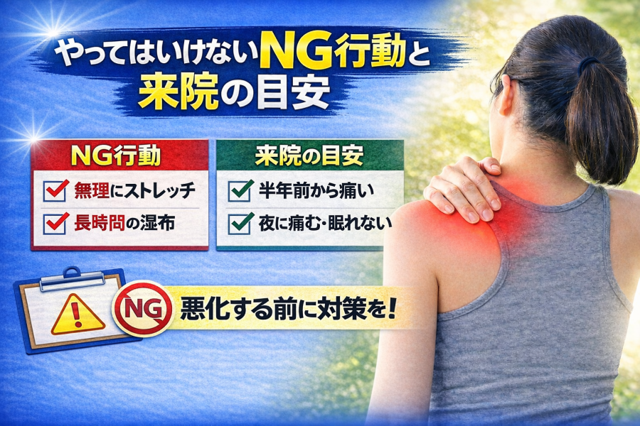 「四十肩 改善のために頑張っているのに、なかなか良くならない…」そんなときは、やっていることが逆効果になっている可能性もあると言われています。実際、参考記事でも間違ったセルフケアや放置が長期化の原因になると指摘されています。ここでは、見落としがちなNG行動と、来院を検討すべきタイミングを整理していきます。