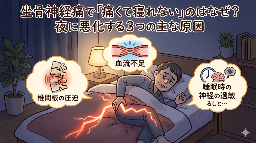 image_85d19ac6「夜になるとお尻から足にかけて痛みが走って、全然寝つけない……」そんな経験はありませんか?昼間は何とか動けていても、布団に入ると急に痛みが強くなるのは本当につらいですよね。なぜ、寝ようとするときに限って坐骨神経痛は悪化するのでしょうか。その理由は、私たちの体の仕組みに深く関わっていると言われています。ここでは、夜に痛みが強まる3つの大きな原因について、詳しくお話ししますね。