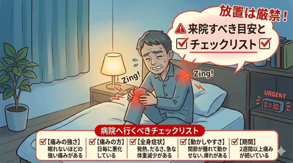 image_c5b62555「坐骨神経痛で痛くて寝れないけれど、これくらいで病院へ行ってもいいのかな……」と、一人で悩んでいませんか?夜の痛みは精神的な消耗も激しいため、無理をして先延ばしにしないことが、早期の改善につながる鍵だと言われています。ここでは、どのタイミングで専門機関を頼るべきか、具体的な来院の目安についてお話ししますね。