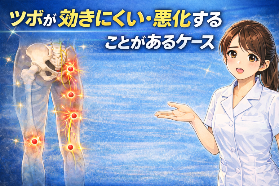 ツボはあくまでセルフケアの一つの方法であり、すべての坐骨神経痛に対応できるわけではないと言われています。姿勢、生活習慣、体の使い方などが重なって症状が出ている場合、ツボだけに頼ると改善を感じづらいこともあります。「できる範囲で取り入れる」「合わなければやめる」といった柔軟な考え方が、セルフケアを続けるうえで大切だと考えられています。
