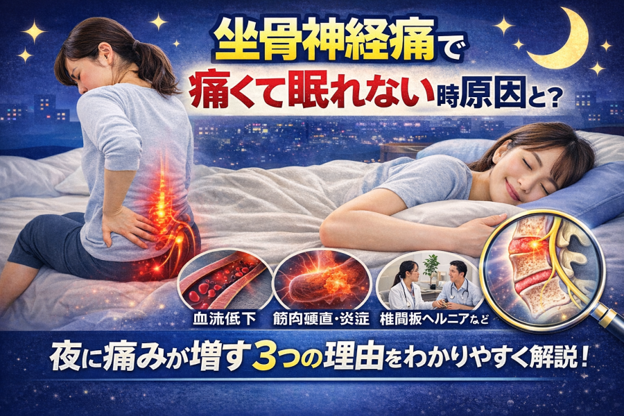 よく聞かれる質問ですが、夜間は体を動かす量が減り、血流が低下しやすくなると言われています。その結果、筋肉がこわばりやすくなり、坐骨神経まわりへの負担が増えることがあるようです。