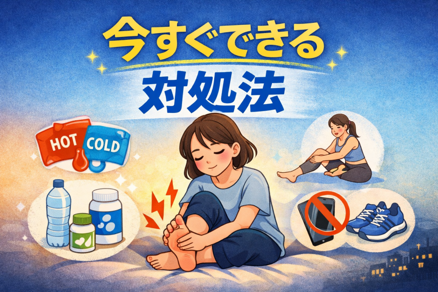 夜中に足が痛くて眠れないとき、「まず何をしたらいいの?」と迷う方も多いと思います。そんなときは、血行を良くするケアから始めるのが一つの方法と言われています。例えば、足首をゆっくり回したり、ふくらはぎを軽く伸ばすだけでも、張りがやわらぐことがあるようです。 「冷えてるかも…」と感じる場合は、ぬるめの足湯もおすすめです。熱すぎるお湯は逆に負担になることがあるため、心地よい温度でじんわり温めるのがポイントです。寝る前に軽くマッサージを取り入れる方も多く、リラックスしながら足の巡りを整える習慣として取り入れやすいと言われています【⭐︎参考記事】https://esthree.jp/column/%e5%a4%9c%e4%b8%ad-%e8%b6%b3%e3%81%8c%e7%97%9b%e3%81%84-%e5%af%9d%e3%82%8c%e3%81%aa%e3%81%84-%e5%a4%a7%e4%ba%ba-%e5%8e%9f%e5%9b%a0%e3%81%a8%e5%af%be%e7%ad%96%e3%82%92%e5%8c%bb%e7%99%82/