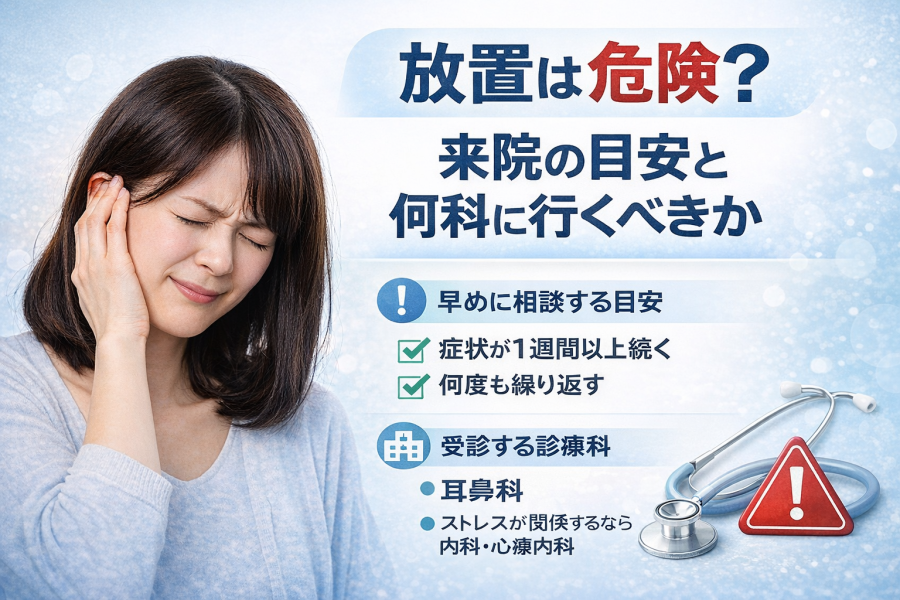 まずチェックしてほしいのが、症状の強さや変化です。「片耳だけ急に強くなった」「めまいや吐き気がある」「音が聞こえにくい」といった場合は、注意が必要と言われています。