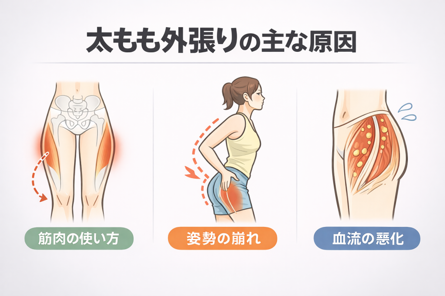 太もも 外張り 原因 をわかりやすく解説。外ももが横に張って太く見える主な原因(筋肉のバランス不良・骨盤の歪み・姿勢・歩き方のクセなど)から、セルフチェック・対策まで、専門家視点で改善ポイントを徹底紹介します。