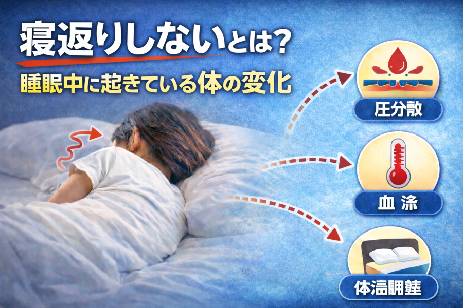 睡眠中、同じ姿勢が続くと、肩や腰など一部に体重が集中します。そこで寝返りを打つことで、体への圧を分散し、血流を保つ働きがあると考えられています。また、布団の中の熱を逃がし、体温を調整する意味もあると言われています。