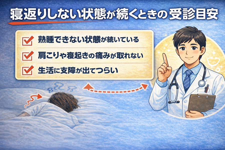 寝返りしない状態が続くと、腰痛や肩こりの原因になることがあります。寝返りが少ない原因、体への影響、今日からできる改善方法と受診の目安をわかりやすく解説します。