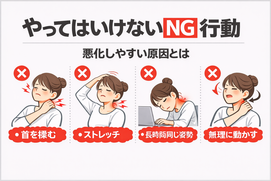 まず大切なのは、無理に動かさないことだと言われています。痛みが出た直後は、首まわりに炎症が起きている可能性があるため、勢いよく起き上がったり、首を回したりするのは控えたほうがよいようです。