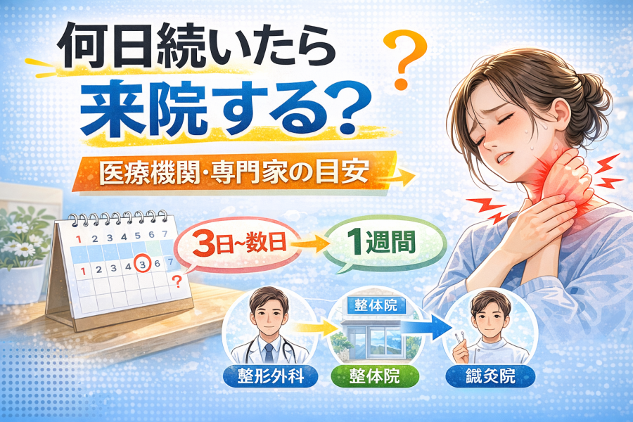 こうした場合は、無理を続けず一度立ち止まることが大切だと考えられています。寝違え由来でも、負担が続くと違和感が強まることがあるため、悪化傾向が見られるときは来院を検討する判断材料になります。