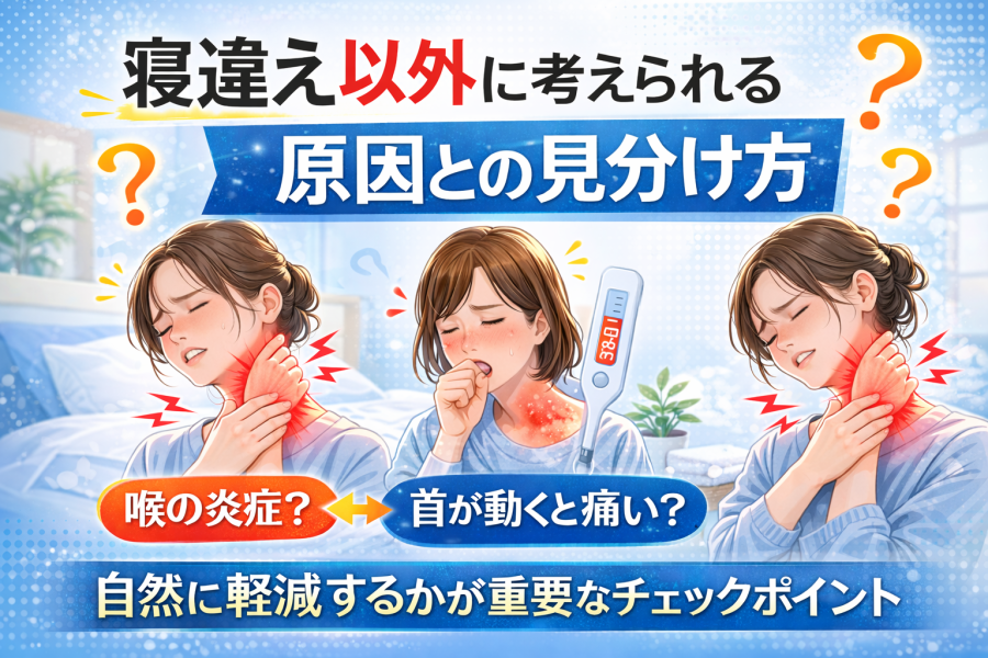 咽頭炎や扁桃炎など喉由来の痛みは、飲み込むたびに強い痛みが続きやすく、首を動かしても変化が少ないと言われています。一方、寝違えが関係している場合は、首を回したり傾けたりすると痛みが増減しやすい傾向があります。この“動きで変わるかどうか”が、ひとつの目安になります。