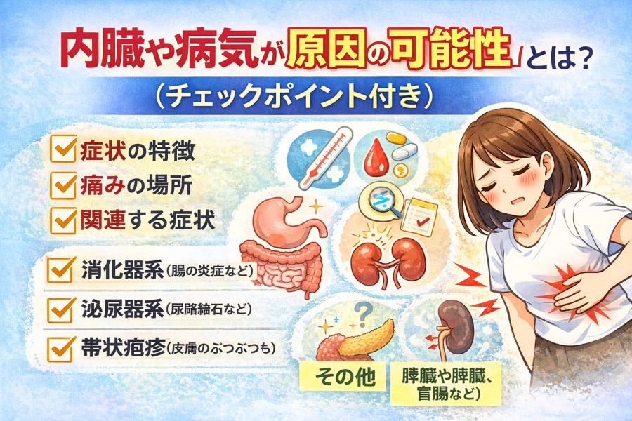 こんな不安、正直ありますよね。ただ実際には、筋肉・姿勢・神経といった比較的軽い原因が関係しているケースも多いと言われています。ここでは、内臓疾患を疑う前に知っておきたい代表的なポイントを整理します。