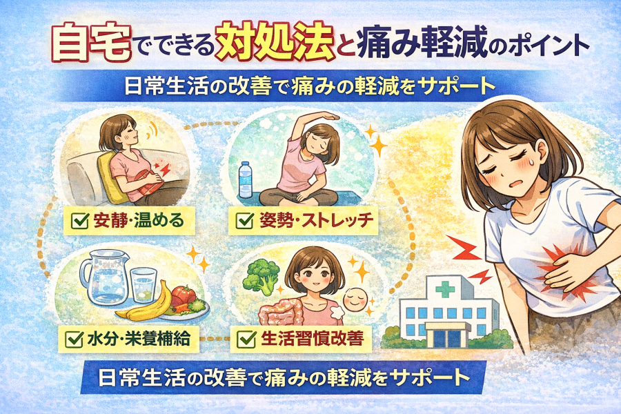 ゆっくり呼吸する時間を作ったり、腹部を冷やさない服装を選んだりするだけでも違いが出ることがあるようです。