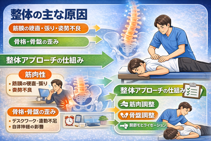 半信半疑になりますよね。ただ、骨盤や背骨の位置関係が崩れることで、腰に負担がかかりやすくなる可能性があるとも言われています。整体では、体全体の動きやクセを見ながら、バランスを整える視点で施術が行われるケースがあるようです。