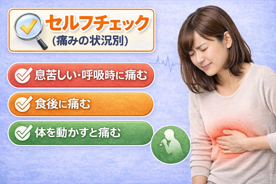 たとえば、深呼吸をしたときに胸の奥やみぞおち付近が痛む、体をひねったり立ち上がったりした瞬間に違和感が出る、といった声がよく聞かれます。
