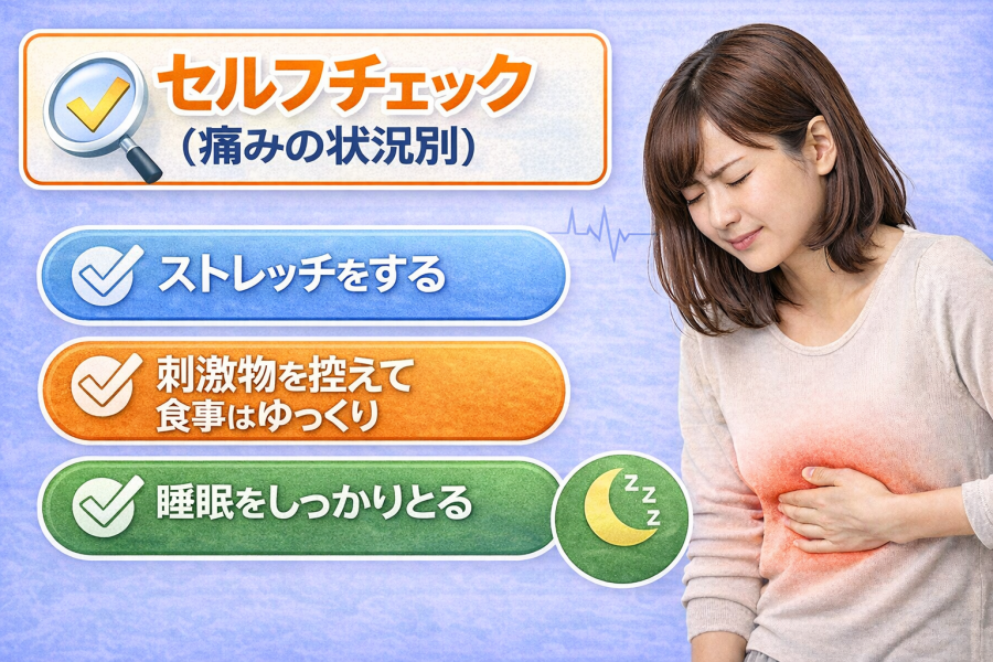そう迷ったときは、痛みの出方や続き方を整理してみるのがひとつの目安になると言われています。ここでは、自分で確認しやすいポイントを状況別にまとめます。