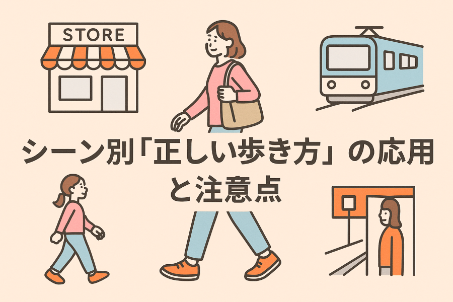 正しい歩き方の基本を身につけても、「どんな場面でどう意識すればいいのか」は意外と難しいものです。通勤や買い物のとき、年齢を重ねて体力が落ちてきたとき、あるいは痛みがあるときなど、状況によって意識すべきポイントは少しずつ変わると言われています。ここでは、日常生活のシーンごとに実践できる“歩き方の応用”を紹介します。
