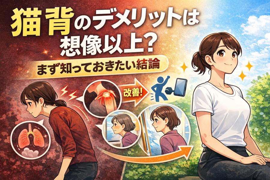 猫背 デメリットを徹底解説。肩こり・腰痛だけでなく見た目や健康リスクにも影響します。本記事では猫背による具体的な悪影響、セルフチェック方法、今すぐできる改善法、放置した場合のリスクまで分かりやすく解説します。