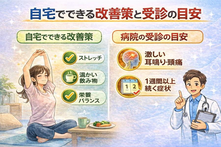 耳鳴り・頭痛・肩こりが続くと、「家で少しでも楽にできる方法はないかな?」と感じる方が多いです。実際、Therapist Planetでも、日常のちょっとした工夫が症状の軽減につながることがあると言われています(引用元:⭐︎参考記事 https://therapistplanet.co.jp/column/066/)。 ここでは、自宅で取り入れやすい改善策を会話形式も交えながらまとめ、さらに来院の目安についても触れていきます。