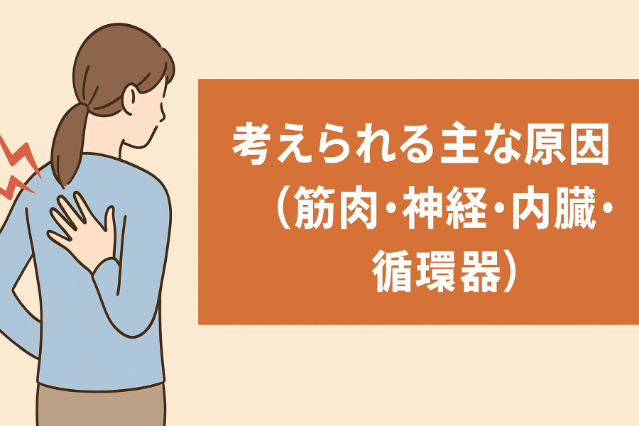 一方で、神経の圧迫や肋間神経痛なども同様の症状を引き起こすことがあります。つまり、「背中+息苦しさ」という組み合わせは、筋肉・神経・内臓・循環器といった複数の要因が絡んでいるため、自己判断だけでは正確に把握しづらいのです。