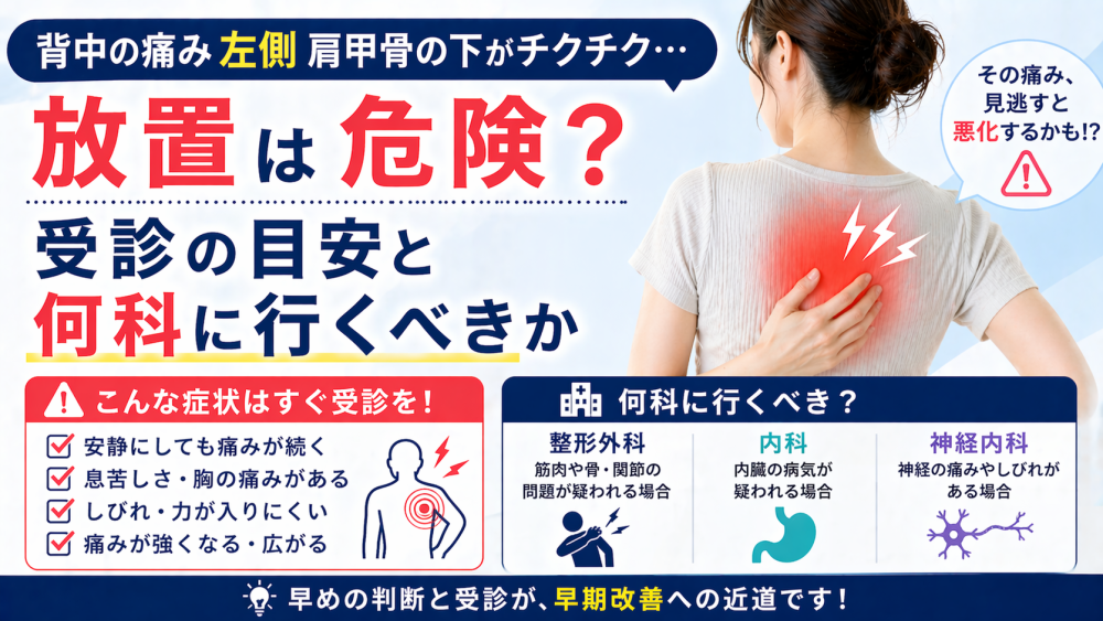 背中の痛み左側 肩甲骨の下 チクチクと感じる原因は筋肉・神経・内臓などさまざまです。本記事では危険サインの見分け方、今すぐできる対処法、受診の目安までわかりやすく解説します。