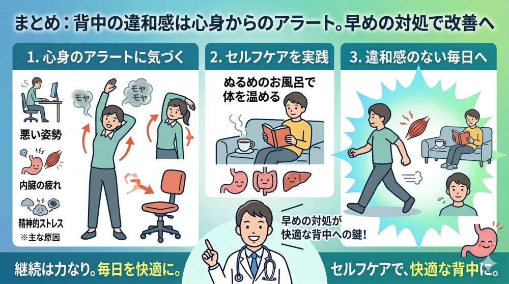 まとめ:背中の違和感は心身からのアラート。早めの対処で改善へ