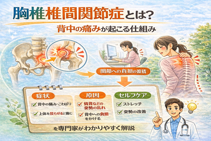 胸椎椎間関節症 は背中の痛みや姿勢不良の原因と言われています。本記事では症状の特徴、原因、悪化しやすい姿勢、医療機関での治療、日常でできるセルフケアまでわかりやすく解説します。