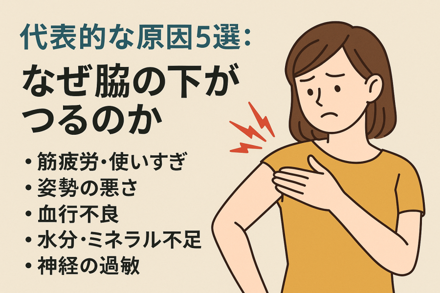 脇の下 つる原因を解消したい方へ。筋肉疲労・姿勢不良・冷え・ミネラル不足など代表的な原因と、すぐできる応急ケア・セルフストレッチ、注意すべき病的ケースまでわかりやすく解説します。